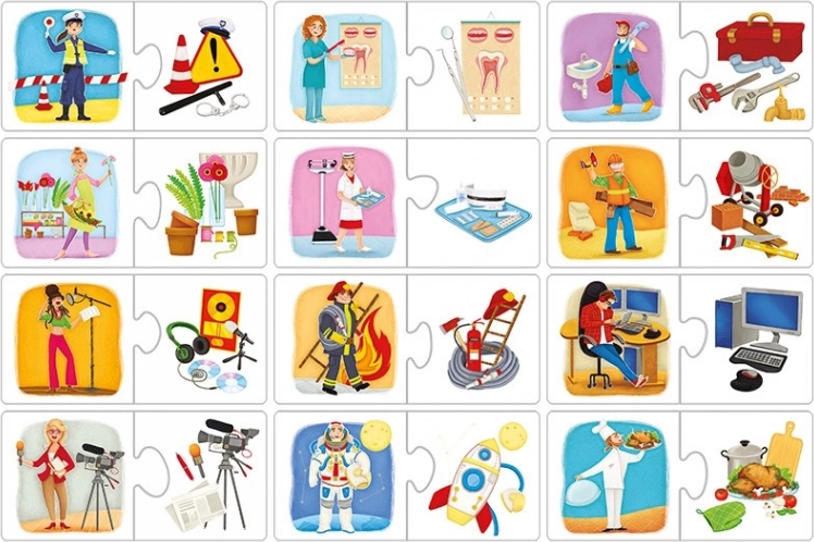 The set includes 24 puzzle pieces that can be assembled into 12 images depicting professions and their traits.
