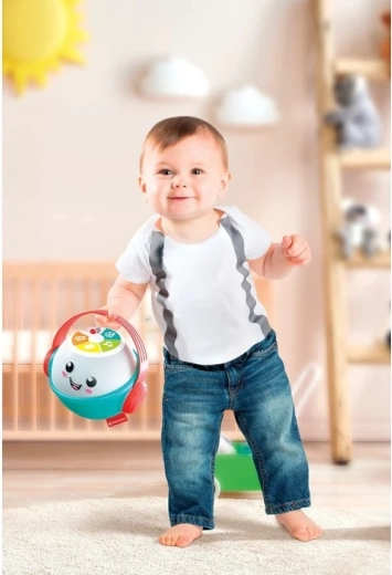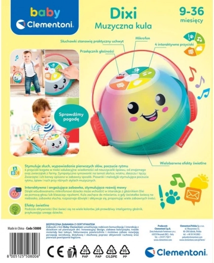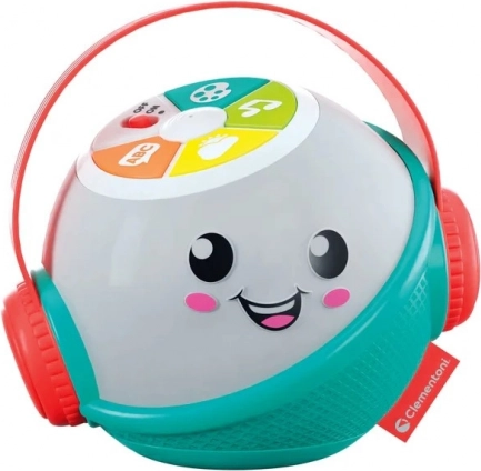 The Dixi musical ball is a friendly interactive companion for first explorations of sounds, words, and rhythm. Children can choose from 4 keys with different themes – weather, colors, animals and their sounds – which support speech development and perception. Cheerful songs and various music genres bring lots of joy and motivate repeated play.