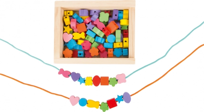 Whether stars, little hearts, or flowers, this wooden box full of wooden threading beads will delight everyone. There are no limits to creativity, so children can create a bracelet or necklace just the way they imagine. Threading beads onto the string trains hand-eye coordination and fine motor skills. Which piece of jewelry will you make first? Main features: 81 colorful beads, 2 strings for threading