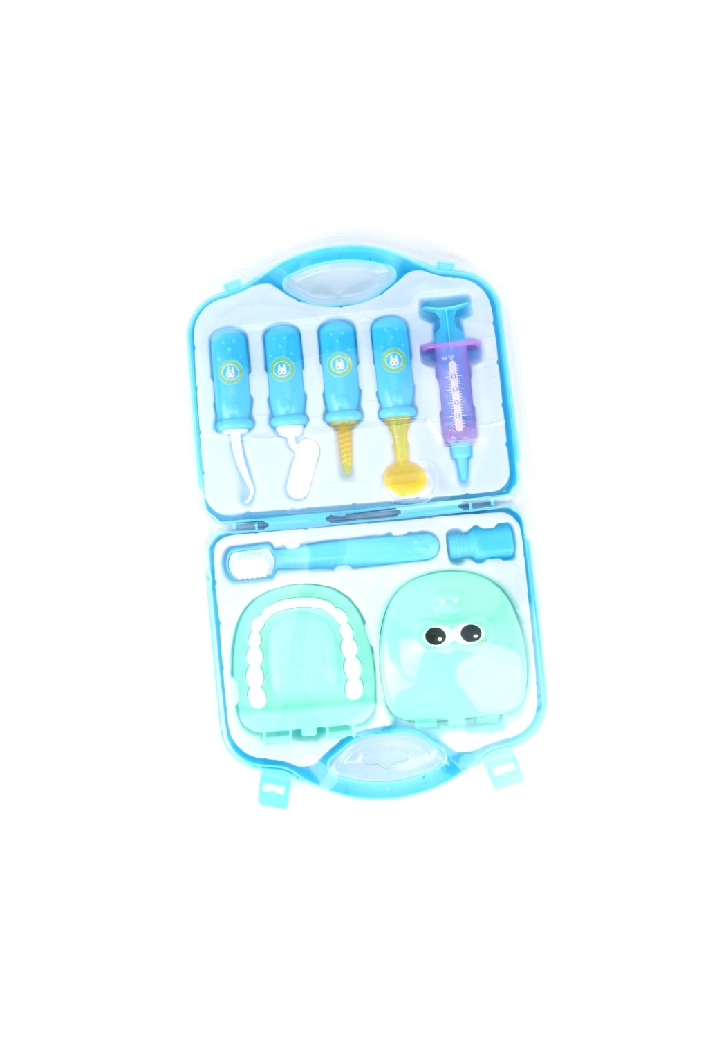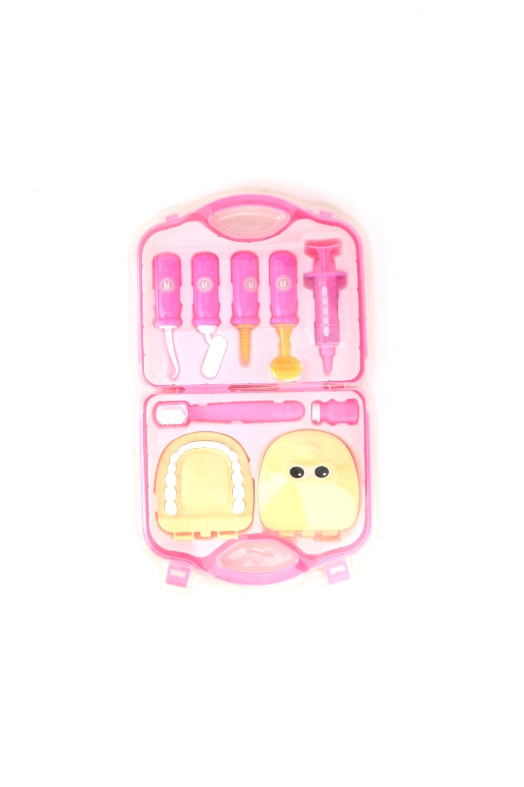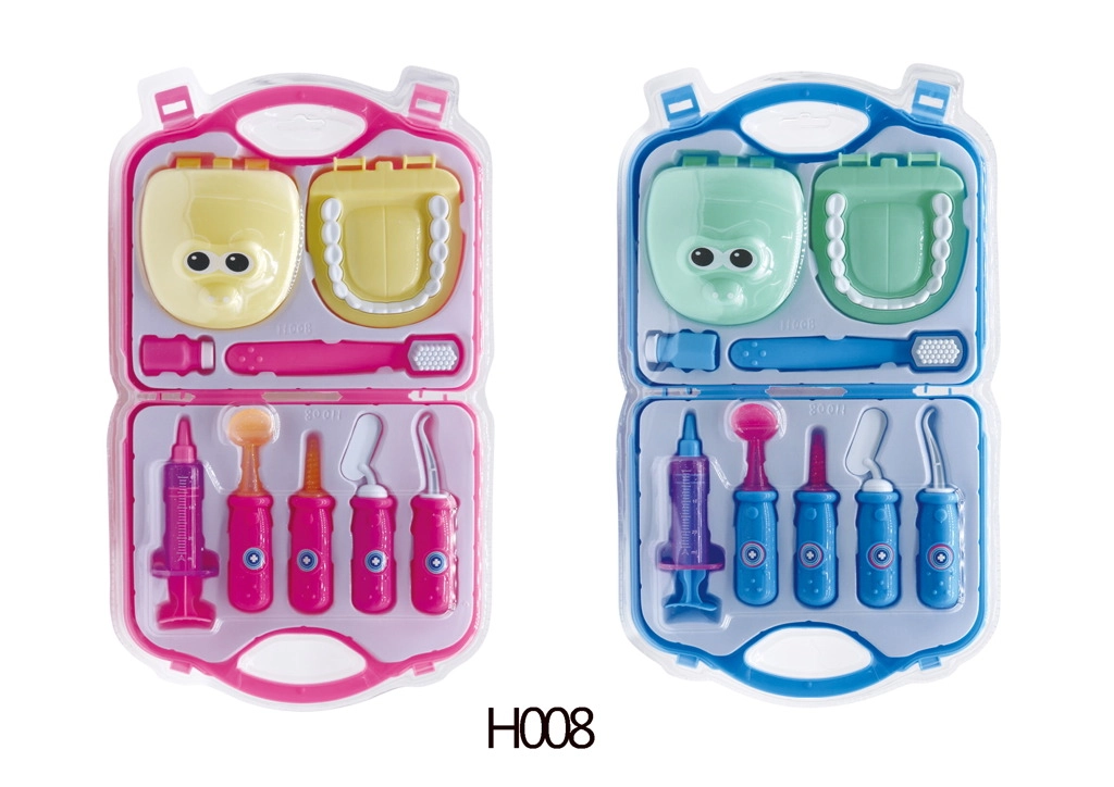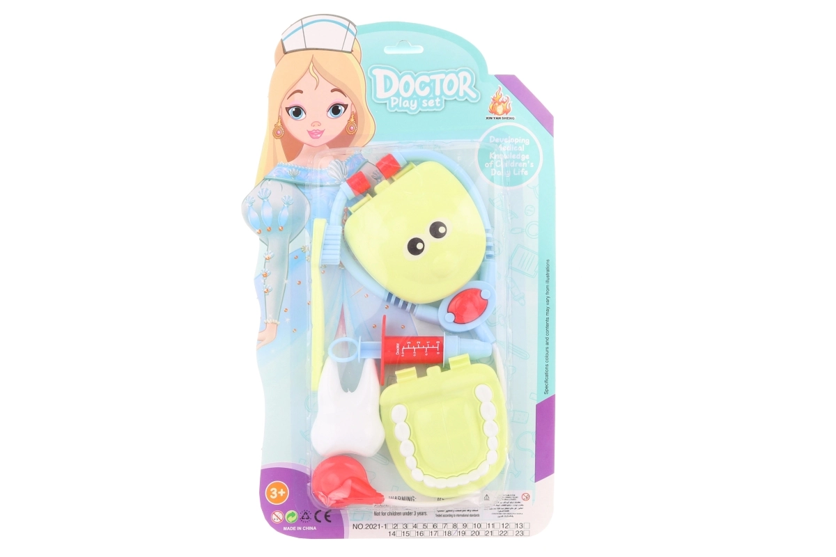 Un set de dentiste pour enfants comprend souvent un miroir dentaire, une sonde, une pince, une pince à épiler, une seringue, une fraise, une brosse à dents, un dentifrice et un modèle de dents ; sans oublier la blouse ou la coiffe de médecin et une mallette médicale pratique. Des formes ergonomiques pour les petites mains, sans bords tranchants et en matériaux sûrs (bois, plastique, textile) développent la motricité fine, la communication et l’empathie, et aident à réduire la peur du dentiste.