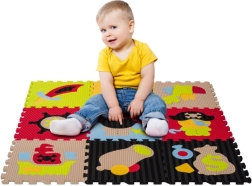 Le puzzle en mousse sur le thème des pirates transforme chaque pièce en zone de jeu sécurisée. Neuf dalles interconnectables avec formes amovibles et textures variées séduisent les enfants par leurs couleurs et leurs sensations au toucher. Le matériau est agréablement doux, facile à nettoyer et amortit les chocs ainsi que le bruit.