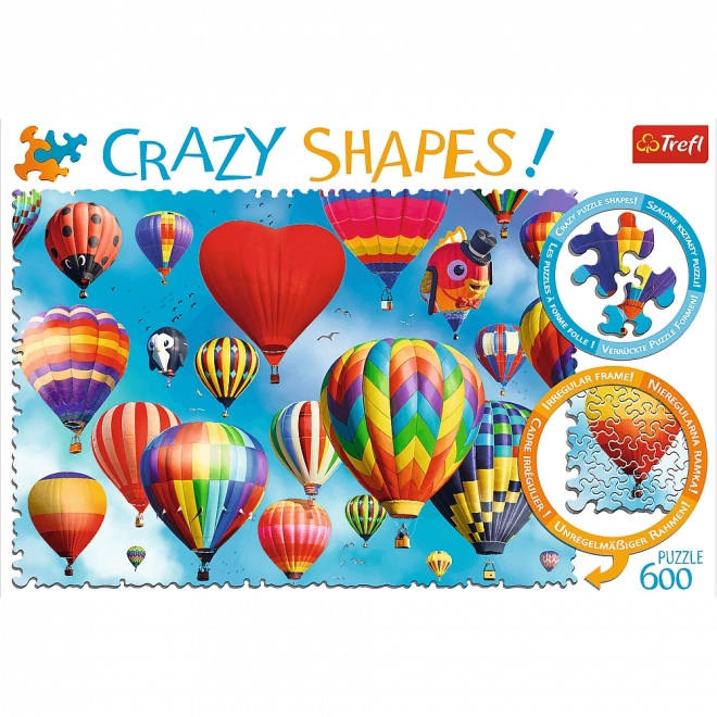 Crazy Shapes ! Cette série présente les puzzles les plus fous au monde, où les pièces ont des formes inhabituelles et folles et vous ne trouverez aucune ligne droite. Ce produit contient 600 pièces et l’image montre des ballons colorés en vol.