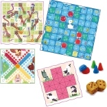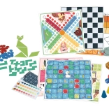 Sur cinq plateaux recto-verso, vous trouverez entre autres Les Petits Chevaux, Dames, Jeu de l’Oie, Serpents et Échelles, Piste de puces sauteuses, Moutons et loups, La Ligne, Adugo, Piste de course, Cascade de puces, Bagh Chal, Lau Kati Kata, ainsi que des casse-têtes logiques Pentamino et Tangram. Grâce aux différents niveaux de difficulté, c’est parfait pour les enfants comme pour les adultes.