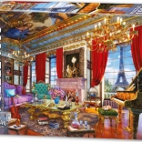 Un intérieur richement décoré avec vue sur la tour Eiffel offre une atmosphère unique et une scène visuellement riche, agréable à assembler et superbe une fois encadrée.