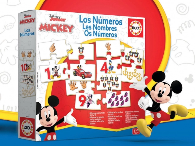 Puzzle Educa Mickey et ses amis pour apprendre les nombres 1–10. Coffret de 10 images de 4 pièces développant motricité, logique et reconnaissance des couleurs. Idéal pour les enfants d’âge préscolaire.
