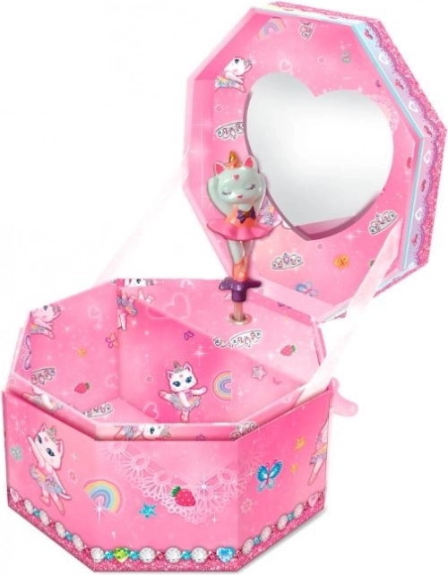 La boîte à bijoux musicale octogonale ornée d’un chat ballerine fera plaisir à chaque enfant. À l’ouverture, la figurine se met à tourner et une mélodie classique retentit. La boîte comprend un miroir, un espace pour les petits objets et fonctionne avec un mécanisme à remontoir sans piles.