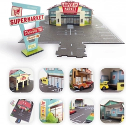 Un supermarché avec restaurant burger, parking et signalisation crée une scène fidèle qui plonge les enfants dans le jeu et stimule leur imagination.