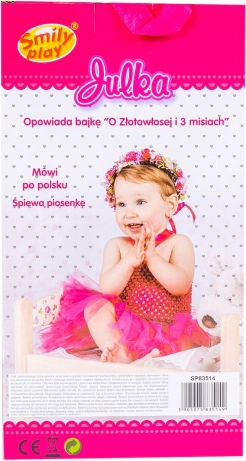En appuyant sur le ventre, la poupée parle polonais en phrases complètes, chante une chanson et raconte le conte de Boucles d’Or et les trois ours. Un divertissement interactif dont les enfants ne se lasseront pas.