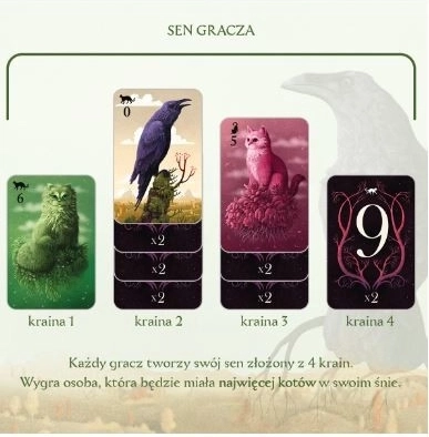 Au cours du jeu, vous visiterez 4 pays de rêves ! Vous y rencontrerez des chats amicaux et de sinistres corbeaux, que vous enverrez dans les rêves de vos adversaires. Gagnera celui qui aura le plus de chats dans son rêve.
