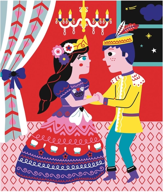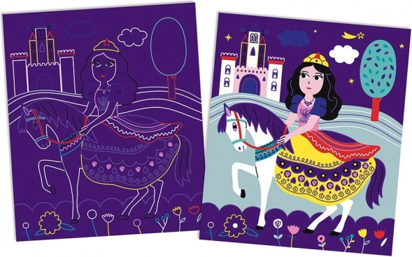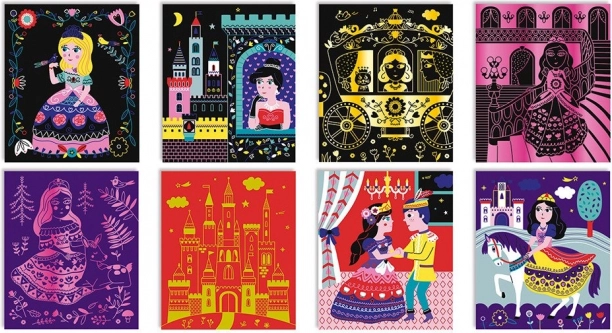 Le coffret contient huit cartes prédessinées avec des princesses, des châteaux et des scènes magiques. Chaque motif inspire les enfants à créer et à inventer leurs propres histoires.