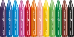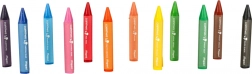 Crayons de cire sûrs pour enfants dès 1 an, set de 12 couleurs. Forme triangulaire JUMBO Ø 13 mm pour une prise en main correcte, gaine en papier anti-salissures, couleurs intenses et tracé doux, non toxiques.