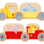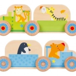 Assemblez votre premier petit train avec deux locomotives et des wagonnets, qui emmènent des animaux en excursion. Jouet sûr en bois massif, idéal pour les petites mains des enfants.