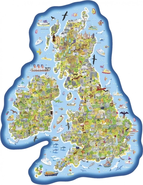 Puzzle en contour Carte de Grande-Bretagne et d’Irlande offrant une vue richement illustrée des animaux typiques, des monuments et des curiosités de chaque région des îles Britanniques. Idéal pour soutenir l’apprentissage et améliorer les connaissances en géographie.