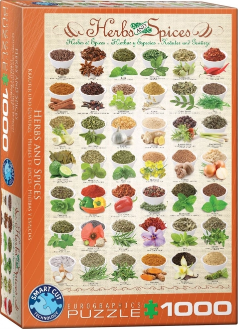 EUROGRAPHICS puzzle 1000 pièces sur le thème des herbes et épices. Découpe irrégulière pour une difficulté accrue, légendes en anglais, dimensions 48,9 × 67,6 cm.