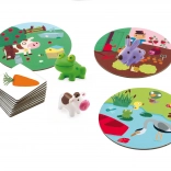 - 1 plateau de jeu, 3 figurines en plastique (lapin, poisson, coccinelle), cartes avec environnements et objets, règles du jeu