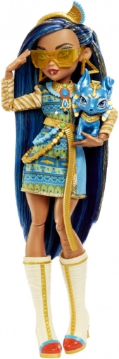 La poupée Cleo De Nile de la collection Monster High brille dans une tenue iconique inspirée de l’Égypte antique : une robe bleu‑or avec des manches rappelant des bandages, complétée par une ceinture chaîne et des bottes hautes sous le genou. Le look est souligné par des bijoux dorés et des lunettes de soleil stylées.