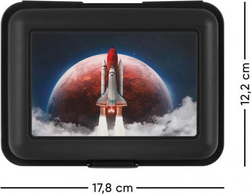 Cette boîte à goûter en plastique a un couvercle avec un thème spatial, affichant le lancement d'une navette spatiale avec une planète en arrière-plan.