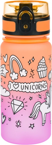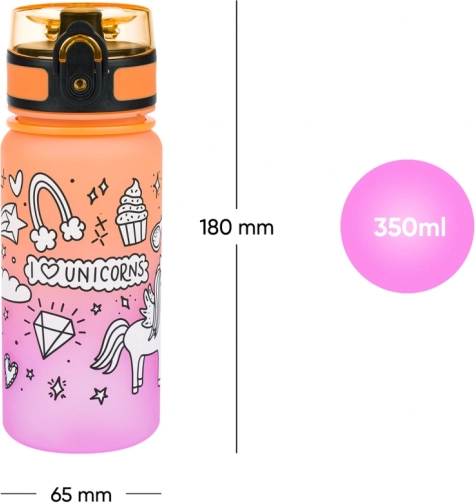 Bouteille stylée en tritan de 350 ml avec motif licorne et dégradé de couleurs, idéale pour l’école, les sorties et le sport. Elle offre un couvercle verrouillable sécurisé, une dragonne pratique et un filtre intérieur pour fruits ou herbes. Fabriquée en tritan certifié sans BPA, sans odeur et adaptée aussi aux boissons chaudes.