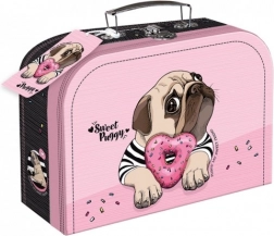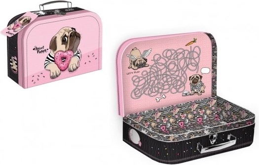 Valisette enfant de haute qualité, cousue avec une boucle métallique et une poignée. La valisette est en papier durci et laminée en surface avec le motif Sweet Puggy.