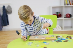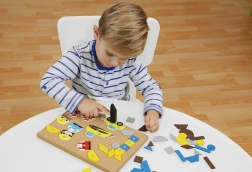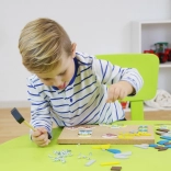 Favorisez la motricité fine et la précision de l’enfant en utilisant le petit marteau pour fixer les formes sur la planche en liège.