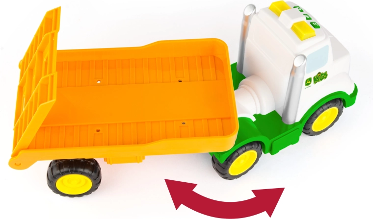 Ce set de jeu combine une semi-remorque avec rampe et le sympathique tracteur Johnny dans les couleurs classiques JOHN DEERE. Les enfants développent leur motricité fine en chargeant et déchargeant, tout en stimulant leur imagination avec des scénarios de ferme. Avec sa longueur de 37 cm, l’ensemble est stable et facile à prendre en main.