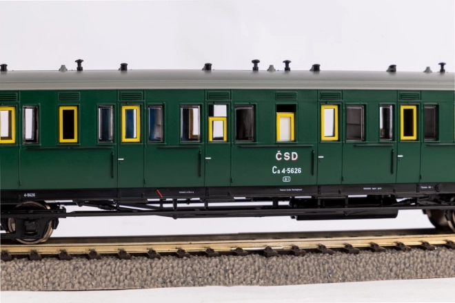 Voiture voyageurs ČSD détaillée avec guérite de frein à l’échelle H0, époque III. Norme NEM, attelage court, longueur 199 mm. Excellent complément pour réseaux de modélisme ferroviaire.