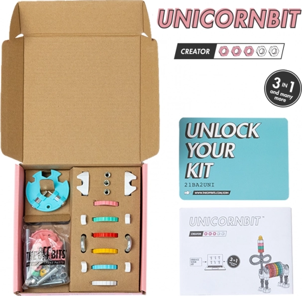 Le magique UnicornBit ouvre aux enfants un monde mêlant fantaisie et compétence technique. À partir d’un seul set, assemblez 3 modèles différents – UnicornBit, le RobotBit féerique ou AutoBit – et, grâce à la compatibilité avec des objets courants de la maison, créez aussi vos propres inventions uniques.