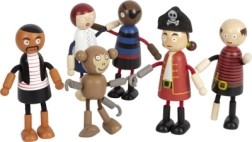 Le set comprend six figurines en bois : un capitaine pirate, quatre membres d'équipage et un singe. Idéal pour enrichir l'univers pirate.