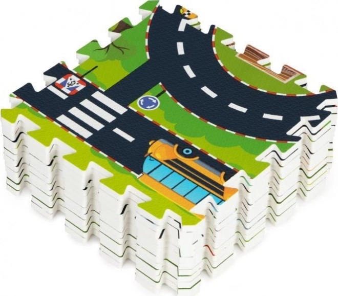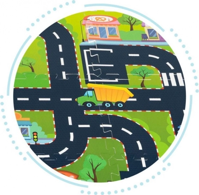 Joyeux tapis puzzle en mousse au motif de ville, routes et carrefours, créant un espace de jeu doux et sûr. 12 pièces (30×30 cm) en mousse EVA certifiée se montent facilement comme un puzzle pour atteindre la dimension de 114×86 cm. Le tapis est antidérapant, amortit les chutes grâce à son épaisseur de 1 cm, isole du froid et s’entretient aisément par un coup de chiffon humide.