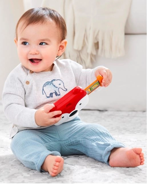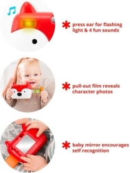 Appuyez sur l’oreille du renard pour activer le clic de l’obturateur, des effets amusants et une lumière clignotante rappelant un flash. Idéal pour la stimulation sensorielle et les premiers jeux de photographe.