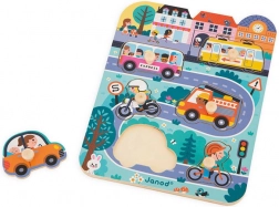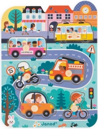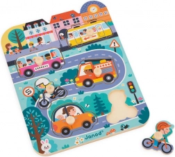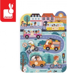 Les puzzles en bois Dans la ville de Janod offrent une façon simple et ludique pour les enfants de se familiariser avec différents moyens de transport. Ce set comprend 7 pièces : tramway, autobus, moto, vélo, voiture et camion de pompiers, le tout sur une planche en bois représentant une scène urbaine.