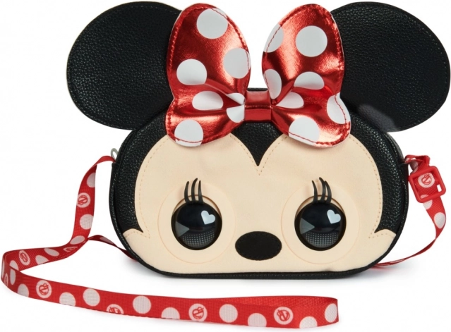 Présentation du sac interactif Minnie Mouse de Disney! Ce sac unique réagit au toucher, cligne des yeux, et peut même vous envoyer un bisou. Fabriqué à partir de matériaux tels que cuir synthétique et suède, il est orné du nœud rouge à pois blancs caractéristique et des yeux captivants et charmants.