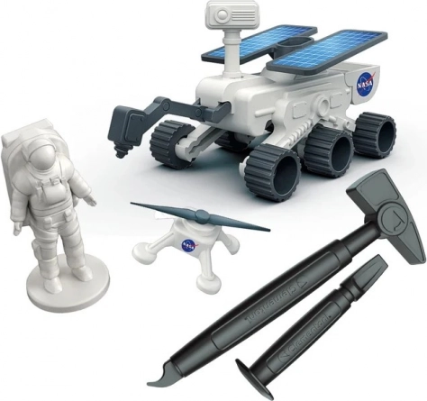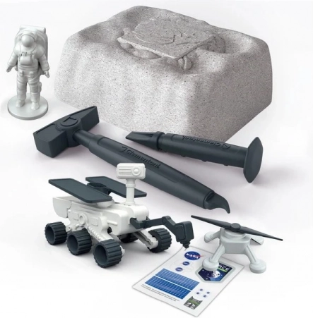 Ce kit interactif relie science et divertissement : à partir d’une brique de plâtre « à creuser », vous extrayez pas à pas des modèles inspirés de véritables missions de la NASA. Une fois découverts, vous pouvez assembler le rover et le drone et partir pour votre propre expédition spatiale.