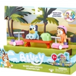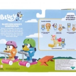 1x figurine Bluey (env. 6 cm), 1x figurine Bingo (env. 6 cm), 2x trottinettes, 2x casques