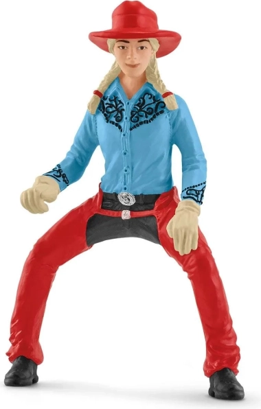 Figurine unique de kovbojka avec chemise bleue et pantalon rouge avec chapeau. Encourage le jeu réaliste et l'amusement.