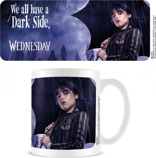 Tasse en céramique élégante avec le motif Wednesday et la citation « We all have a Dark Side », parfaite pour le café ou le thé au quotidien. Elle offre un volume de 315 ml, est compatible micro-ondes et lave-vaisselle et est livrée dans un coffret cadeau.
