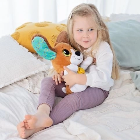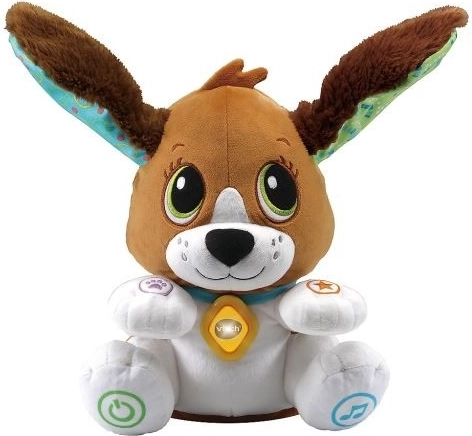 Le chien Mon ami de VTech est un chien interactif et enjoué pour les tout-petits. Il remue joyeusement la tête et les oreilles, imitant ainsi l’écoute. Le chien possède 5 boutons situés sur ses pattes et son ventre. Le bouton – collier lance l’enregistrement des sons. Après un moment, le jouet rejoue les mots enregistrés de manière amusante. Le bouton – patte déclenche l’écoute d’histoires et de questions intéressantes qui encouragent les tout-petits à prononcer des mots et à répondre. Le bouton – étoile fait découvrir aux enfants l’alphabet et le comptage jusqu’à 10. Le bouton – note joue des chansons et des mélodies. Mon ami le chien est un jouet adapté aux enfants à partir d’un an.