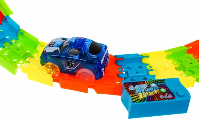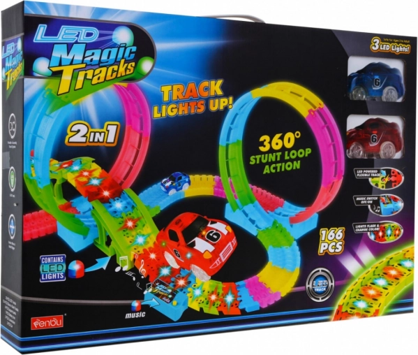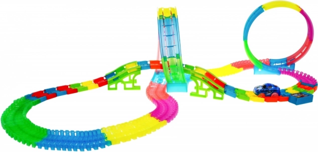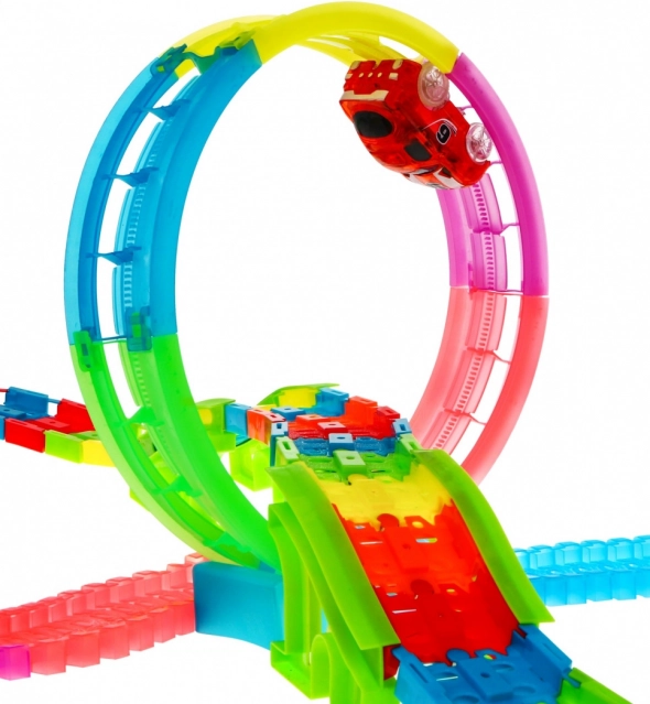 - Piste fluorescente brillante dans le noir, éclairage LED, panneau musical intégré, loopings 360°, dénivelés