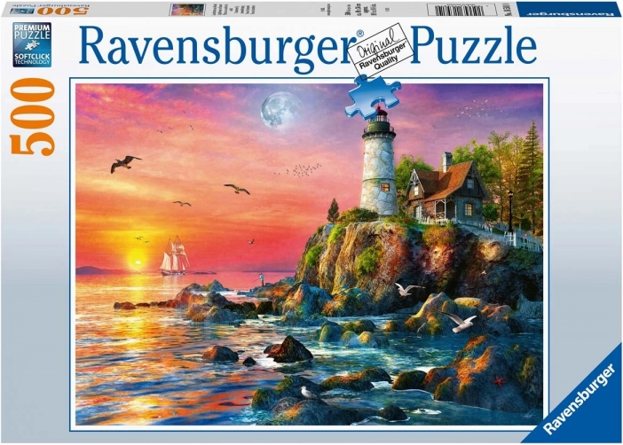 Puzzle Ravensburger 500 pièces avec motif de phare au coucher du soleil. Finition de qualité, pièces précises et détente pour toute la famille. Idée cadeau idéale.