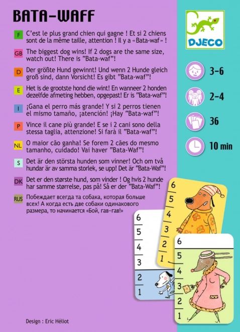 Le jeu de cartes amusant DJECO Bata-Waf pour 2 à 4 joueurs s’inspire du classique bataille. Idéal pour les jeunes enfants qui ne savent pas encore compter – c’est le plus grand chien sur la carte qui l’emporte. Un jeu familial rapide d’environ 10 minutes aux règles simples.
