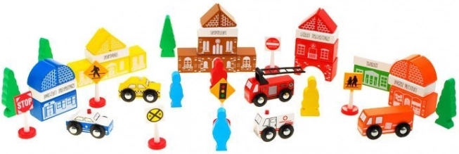 Les blocs ont une texture agréable et sont de taille appropriée pour les petites mains d'enfants. Exemples de dimensions : bâtiments (env. 3cm x 6cm x 3cm), ambulance (3,5cm x 5cm x 3cm), camion de pompiers (5,5cm x 8,5cm x 3cm), police (4cm x 6cm x 3cm), figures (5cm x 2,5cm x 1cm), panneaux de signalisation (hauteur 7cm) fabriqués en plastique.