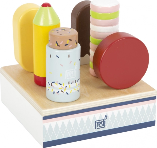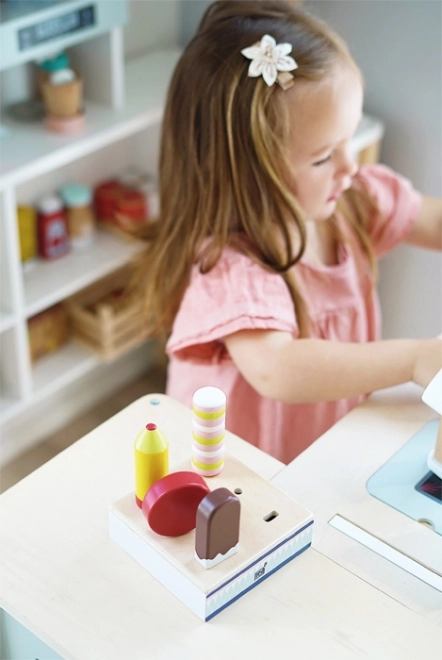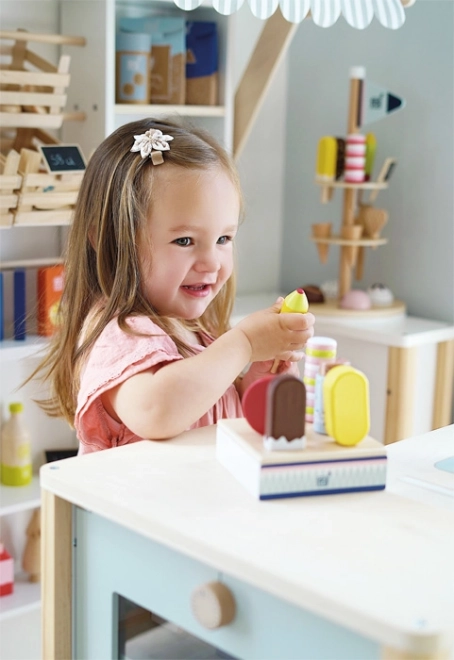 Des glaces colorées aux formes réalistes invitent à la dégustation et encouragent le jeu créatif de rôle entre vendeurs et clients.