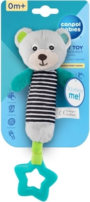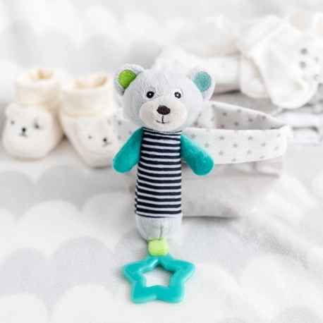 L’haltère en peluche à grelot avec anneau de dentition de la collection OURSONS, en rouge, est destinée aux tout-petits. Les couleurs vives attirent l’attention de l’enfant. Le jouet est léger et facile à tenir. Agréable au toucher, il couine lorsqu’on le presse. Il contient un anneau de dentition, des éléments sonores (couinement) et bruissants. Mode d’emploi: Maintenir propre. Les instructions d’entretien figurent sur l’étiquette cousue. Avertissement! Important pour la santé et la sécurité de votre enfant! Avant chaque utilisation, vérifiez soigneusement le produit. Au premier signe de détérioration ou d’usure, jetez-le immédiatement et ne l’utilisez plus. Le jouet en peluche répond aux exigences suivantes: Directive 2009/48/CE du Parlement européen et du Conseil relative à la sécurité des jouets EN 71 - 1 Sécurité des jouets - Partie 1: Propriétés mécaniques et physiques EN 71 - 2 Sécurité des jouets - Partie 2: Inflammabilité EN 71 - 3 Sécurité des jouets - Partie 3: Migration de certains éléments