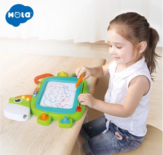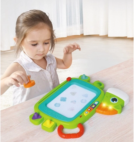 Cette tablette magique colorée offre de nombreuses fonctionnalités étonnantes qui encouragent la créativité et le développement de la motricité fine des enfants. Vous pouvez y dessiner, écrire avec le stylet ou créer des motifs à l’aide des tampons. Une fois le dessin terminé, l’image peut être facilement effacée grâce au mécanisme d’effacement coulissant. Le jeu interactif est accompagné d’effets lumineux et sonores :