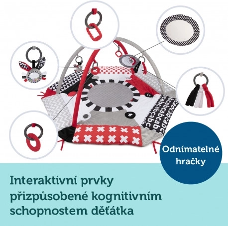 Conçu avec un souci de sécurité et de qualité, le tapis répond aux exigences des directives européennes relatives à la sécurité des jouets. Idéal pour les nouveau-nés, qui perçoivent d’abord surtout les contrastes. Les jouets peuvent être facilement détachés et utilisés séparément, ce qui élargit encore les possibilités de jeu et de divertissement.