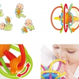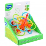 Les anneaux entrelacés en plastique flexible se tiennent bien dans les petites mains, entraînent la préhension et la coordination œil–main dès les premiers mois.