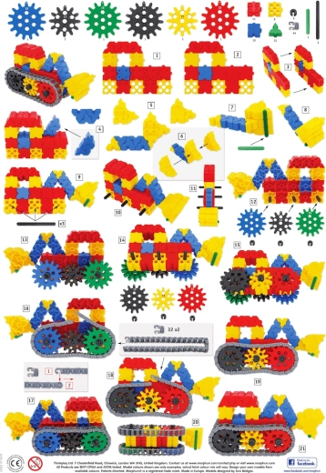 Le set MORPHUN GearPhun apporte des blocs colorés, des roues dentées en 5 tailles, des chaînes, des connecteurs et d’autres éléments pour construire des mécanismes fonctionnels. L’ensemble comprend 4 planches de guides grâce auxquelles les enfants construisent pas à pas des machines, des véhicules et d’autres constructions mobiles – de la pelle à chenilles au rouleau compresseur.