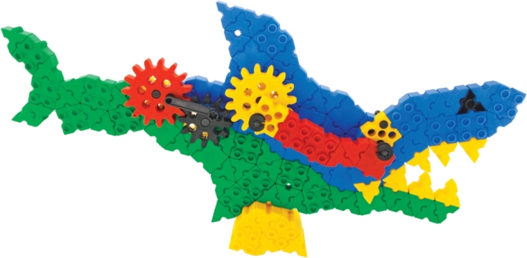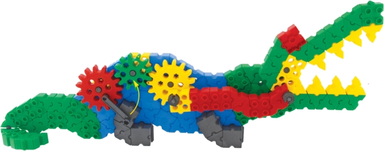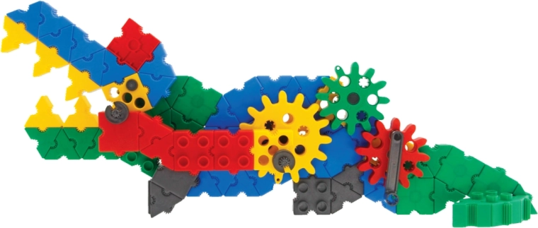 Grâce aux engrenages et aux pièces connectables, les enfants créent un requin et un crocodile avec un mouvement réel. Ils apprennent les principes des transmissions de manière ludique.