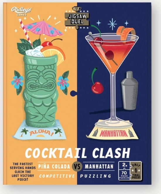 Puzzle de course rapide pour deux : Piña Colada vs Manhattan, 2×70 pièces. La dernière pièce double face sur un support en bois décide du vainqueur.