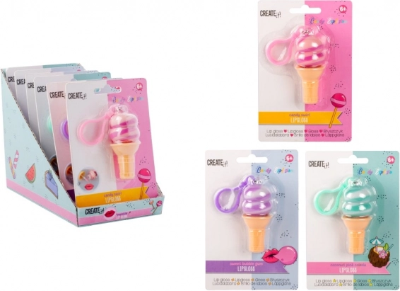 Adorable brillant à lèvres en forme de cône de glace faisant aussi office de porte-clés. Disponible en trois variantes de couleur et trois parfums, idéal pour raviver rapidement les lèvres et comme accessoire stylé pour sac ou clés.